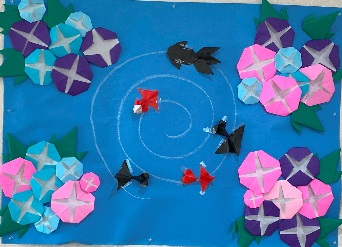 夏の風物詩とも言える金魚が泳ぐ池と色とりどりのアサガオが咲く風景。見ているだけで、少しの間涼しさを感じます。