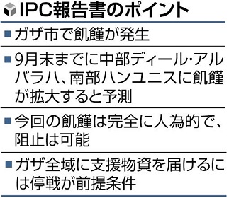 【エルサレム=福島利之】国連機関などが参加する食料危機の深刻度を判断する枠組み「総合的食料安全保障レベル分類」(IPC)は22日、パレスチナ自治区ガザ北部のガザ市で飢饉(ききん)が発生しているとの報告書を発表した。イスラエルとイスラム主義組織ハマスの戦闘が続くガザを巡り、国際機関が飢饉を宣言するのは初めて。IPCは「飢饉は人為的」と指摘し、停戦を求めた。