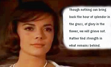 あるいは僕の涙腺が弱すぎるせいかもしれないが、観るたびに胸打たれる映画というのがある。 『草原の輝き』もそのひとつである。 『アメリカン・グラフィティ』を観たときもふとこの映画のことを思いだして哀しい気持ちになってしまった。 僕はナタリー・ウッドの演技を観て感心した記憶は殆どないが、この映画だけは唯一の例外である。 青春というものの発する理不尽な力に打ちのめされていく傷つきやすい少女の心の動きを 彼女は実に見事に表現している。