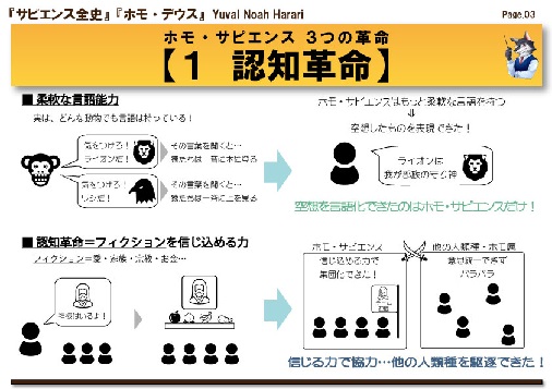 私たちには、天地創造の物語や、近代国家の民主主義のような、共通の神話を紡ぎだす力がある。この能力が、無数の赤の他人と柔軟なかたちで協力することを可能にさせた。