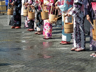 現代の打ち水。地域や企業などのイベントとして行われることもある