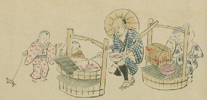 夏になると、「ひゃっこい、ひゃっこい」という声で売り歩く冷水(ひやみず)売りの姿が見られました。冷水売りは、冷たいわき水に砂糖や白玉を入れたものを売り歩きます。1ぱい4文(現在の100円ほど)と、庶民にも手軽に涼を得られる値段でした。