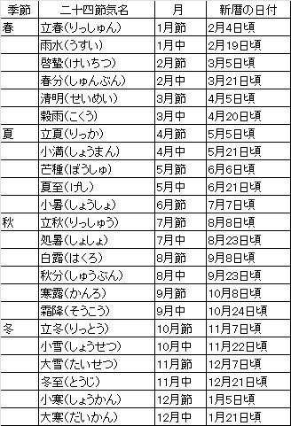 太陰太陽暦(旧暦)の閏月を設ける基準となっており、中気のない月を閏月としていました。二十四節気は、その年によって1日程度前後することがあります。