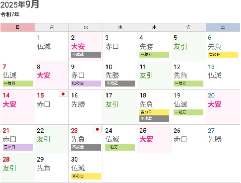 9月5日(金)、9月11日(木)、9月17日(水):友引、大明日、母倉日。
