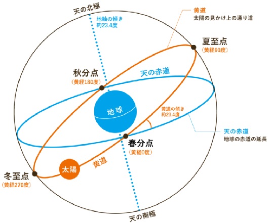 天文学的には、春分~夏至を春、夏至~秋分を夏、秋分~冬至を秋、冬至~春分を冬としています。春分、夏至、秋分、冬至は太陽の黄経によって求められています。