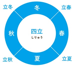 また、立春、立夏、立秋、立冬の四つを四立といいます。それぞれ二至二分の中間地点となり、季節の始まりとされています。中でも二十四節気の1番目である立春は、季節が一巡りし、新たな季節の始まりとして特に重要になります。