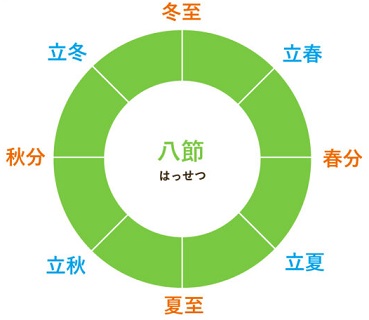 二至二分と四立を合わせて八節(はっせつ)といい、一節は1年を8等分した約45日間になります。