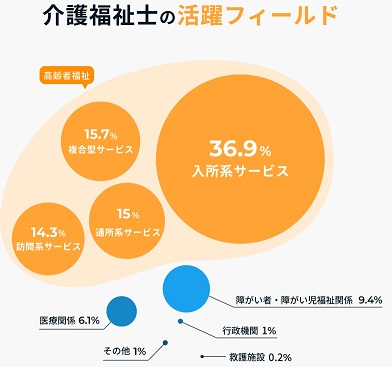 主に、特別養護老人ホーム、老人保健施設、医療施設など、多くの場所で活躍していることが分かります。