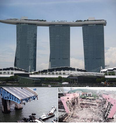 サンズの右側の建物は最高52度の傾斜もあるそうです。イタリアのピサの斜塔は傾斜角5.5度なのでそれの10倍近くも傾斜があることになります。万一倒壊したら、カジノなどがある巨大地下街への影響もあると思われます。数万人の犠牲者が出る可能性もあります。怖いですね!!