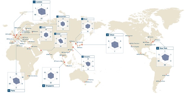 ロンドンは14年連続で首位の座を堅持した。昨年からスコアを着実に伸ばしてきた東京は、ついにニューヨークを抜いて2位に浮上。4位のパリもスコアをさらに伸ばし、3位ニューヨークとの差を縮めている。5位のシンガポールは安定した推移を示す一方、6位ソウルがその背後に迫り、上海はドバイとベルリンを上回って初めて8位にランクインした。