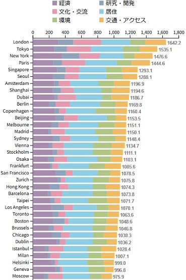1位のロンドンは総合スコアを落としたものの、2012年からトップを維持し続けている。文化・交流分野、交通・アクセス分野では1位を、経済分野、研究・開発分野では2 位を堅持している。居住分野、環境分野では順位を大きく下げたが、「緑地の充実度」で1位を獲得するなどポジティブな変化も見られた。