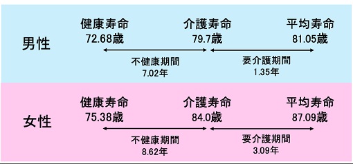 ・女性:健康寿命75.38歳:介護寿命84.0歳:平均寿命87.09歳