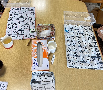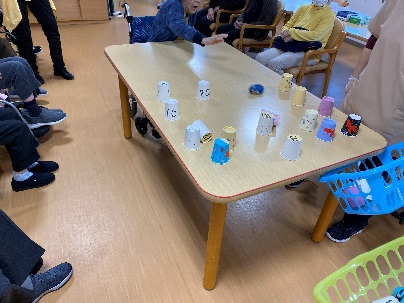 12月のデイサービスレクリエーションの様子です。お手玉をボーリングのボール、紙コップをお手玉に見立て当たった点数で競います。紙コップ同士は隙間が空いているので1ピンも当たらないことがあります。皆さん何とか上手にプレーされていました。