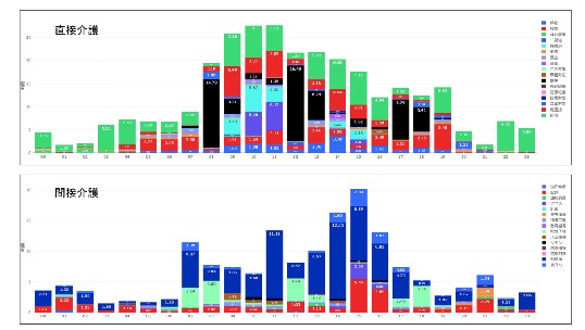 《 タイムスタディによる直接介護・間接介護の業務分析(時間帯別)》