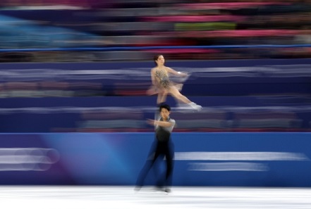 「この写真ではスローシャッターを使い、スケーターとほぼ同じスピードでカメラを振る、流し撮りの技法を用いました。背景を流してぼかしながら、被写体にはしっかりとピントを合わせることで、氷上を駆け抜ける彼らのスピード感と迫力を捉えることを狙いました。この技術は非常に難しく、わずかな手ブレでも顔までぼやけてしまいます。幸いにも、動きによる躍動感を表現しながら、2人の表情をシャープに保つことができました」